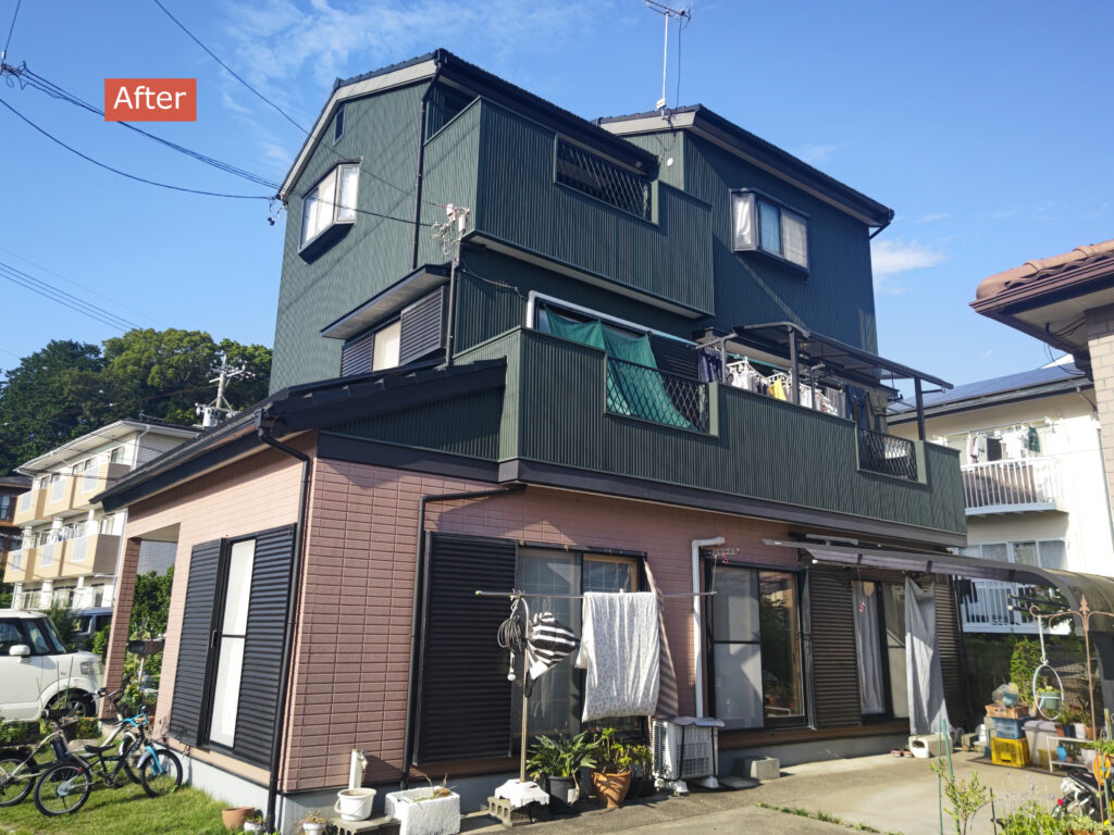傷んだサイディング外壁の上からガルバリウム鋼板を張りました。これに先立って、2世帯住宅だった間取りの1階を変更する工事を行わせていただき、今回はその家の外装メンテナンスです。